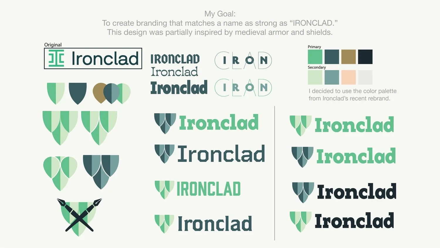 Ironclad is a software company that digitizes and manages contracts. While they had a recent rebrand, I still felt like more could be done to really convey this idea of being “Ironclad.” My scale logo is inspired by medieval shields and armor, demonstrating the strength and security you would want from software that handles your most important documents. This logo went through a number of revisions, with some of the earlier ideas being more on-the-nose with the medieval theme and the final being a fusion of modern and traditional.